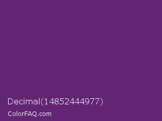 Decimal 14852444977 Color is a dark purple color and the nearest color is Imperial #602f6b. Hex code #612573 and RGB value is rgb(97,37,115). In RGB color space, this color is composed of 38% red, 15% green, 45% blue, In CMYK color space, this color is composed of 16% cyan, 68% magenta, 0% yellow , 55% black , In HSL color space, this color has a hue angle of 286° , 51% saturation and 30% lightness.