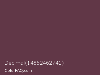 Decimal 14852462741 Color is a dark rose color and the nearest color is Wine Dregs #673147. Hex code #613747 and RGB value is rgb(97,55,71). In RGB color space, this color is composed of 38% red, 22% green, 28% blue, In CMYK color space, this color is composed of 0% cyan, 43% magenta, 27% yellow , 62% black , In HSL color space, this color has a hue angle of 337° , 28% saturation and 30% lightness.