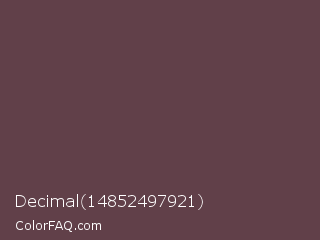 Decimal 14852497921 Color is a normal rose color and the nearest color is Deep Tuscan Red #66424d. Hex code #614049 and RGB value is rgb(97,64,73). In RGB color space, this color is composed of 38% red, 25% green, 29% blue, In CMYK color space, this color is composed of 0% cyan, 34% magenta, 25% yellow , 62% black , In HSL color space, this color has a hue angle of 344° , 20% saturation and 32% lightness.
