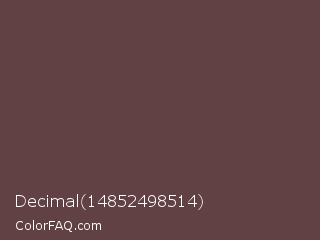 Decimal 14852498514 Color is a normal red color and the nearest color is Rose Ebony #674846. Hex code #614144 and RGB value is rgb(97,65,68). In RGB color space, this color is composed of 38% red, 25% green, 27% blue, In CMYK color space, this color is composed of 0% cyan, 33% magenta, 30% yellow , 62% black , In HSL color space, this color has a hue angle of 354° , 20% saturation and 32% lightness.
