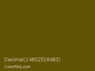 Decimal 14852518483 Color is a very dark yellow color and the nearest color is Saratoga #555b10. Hex code #615405 and RGB value is rgb(97,84,5). In RGB color space, this color is composed of 38% red, 33% green, 2% blue, In CMYK color space, this color is composed of 0% cyan, 13% magenta, 95% yellow , 62% black , In HSL color space, this color has a hue angle of 52° , 90% saturation and 20% lightness.