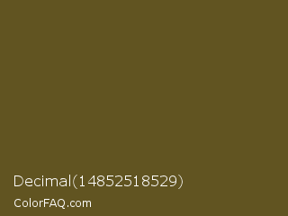 Decimal 14852518529 Color is a dark yellow color and the nearest color is West Coast #625119. Hex code #615421 and RGB value is rgb(97,84,33). In RGB color space, this color is composed of 38% red, 33% green, 13% blue, In CMYK color space, this color is composed of 0% cyan, 13% magenta, 66% yellow , 62% black , In HSL color space, this color has a hue angle of 48° , 49% saturation and 25% lightness.