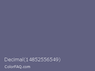 Decimal 14852556549 Color is a normal blue color and the nearest color is Dolphin #646077. Hex code #616181 and RGB value is rgb(97,97,129). In RGB color space, this color is composed of 38% red, 38% green, 51% blue, In CMYK color space, this color is composed of 25% cyan, 25% magenta, 0% yellow , 49% black , In HSL color space, this color has a hue angle of 240° , 14% saturation and 44% lightness.