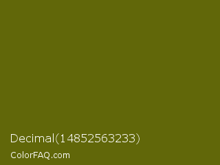 Decimal 14852563233 Color is a very dark yellow color and the nearest color is Saratoga #555b10. Hex code #616709 and RGB value is rgb(97,103,9). In RGB color space, this color is composed of 38% red, 40% green, 4% blue, In CMYK color space, this color is composed of 6% cyan, 0% magenta, 91% yellow , 60% black , In HSL color space, this color has a hue angle of 64° , 84% saturation and 22% lightness.