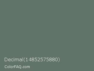 Decimal 14852575880 Color is a normal green color and the nearest color is Corduroy #606e68. Hex code #617368 and RGB value is rgb(97,115,104). In RGB color space, this color is composed of 38% red, 45% green, 41% blue, In CMYK color space, this color is composed of 16% cyan, 0% magenta, 10% yellow , 55% black , In HSL color space, this color has a hue angle of 143° , 8% saturation and 42% lightness.