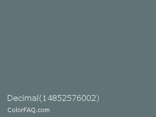 Decimal 14852576002 Color is a normal cyan color and the nearest color is Nevada #646e75. Hex code #617376 and RGB value is rgb(97,115,118). In RGB color space, this color is composed of 38% red, 45% green, 46% blue, In CMYK color space, this color is composed of 18% cyan, 3% magenta, 0% yellow , 54% black , In HSL color space, this color has a hue angle of 189° , 10% saturation and 42% lightness.