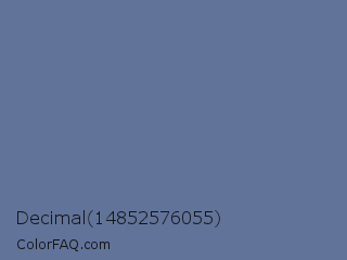 Decimal 14852576055 Color is a normal blue color and the nearest color is Waikawa Gray #5a6e9c. Hex code #617399 and RGB value is rgb(97,115,153). In RGB color space, this color is composed of 38% red, 45% green, 60% blue, In CMYK color space, this color is composed of 37% cyan, 25% magenta, 0% yellow , 40% black , In HSL color space, this color has a hue angle of 221° , 22% saturation and 49% lightness.