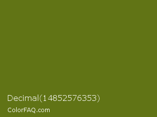 Decimal 14852576353 Color is a dark lime color and the nearest color is Fern Frond #657220. Hex code #617415 and RGB value is rgb(97,116,21). In RGB color space, this color is composed of 38% red, 45% green, 8% blue, In CMYK color space, this color is composed of 16% cyan, 0% magenta, 82% yellow , 55% black , In HSL color space, this color has a hue angle of 72° , 69% saturation and 27% lightness.