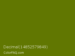 Decimal 14852579849 Color is a dark lime color and the nearest color is Avocado #568203. Hex code #617701 and RGB value is rgb(97,119,1). In RGB color space, this color is composed of 38% red, 47% green, 0% blue, In CMYK color space, this color is composed of 18% cyan, 0% magenta, 99% yellow , 53% black , In HSL color space, this color has a hue angle of 71° , 98% saturation and 24% lightness.