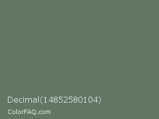 Decimal 14852580104 Color is a normal green color and the nearest color is Willow Grove #65745d. Hex code #617764 and RGB value is rgb(97,119,100). In RGB color space, this color is composed of 38% red, 47% green, 39% blue, In CMYK color space, this color is composed of 18% cyan, 0% magenta, 16% yellow , 53% black , In HSL color space, this color has a hue angle of 128° , 10% saturation and 42% lightness.