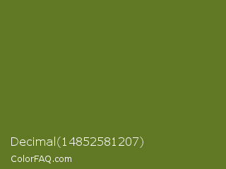 Decimal 14852581207 Color is a normal lime color and the nearest color is Fern Frond #657220. Hex code #617925 and RGB value is rgb(97,121,37). In RGB color space, this color is composed of 38% red, 47% green, 15% blue, In CMYK color space, this color is composed of 20% cyan, 0% magenta, 69% yellow , 53% black , In HSL color space, this color has a hue angle of 77° , 53% saturation and 31% lightness.
