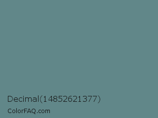 Decimal 14852621377 Color is a normal cyan color and the nearest color is Steel Teal #5f8a8b. Hex code #618789 and RGB value is rgb(97,135,137). In RGB color space, this color is composed of 38% red, 53% green, 54% blue, In CMYK color space, this color is composed of 29% cyan, 1% magenta, 0% yellow , 46% black , In HSL color space, this color has a hue angle of 183° , 17% saturation and 46% lightness.