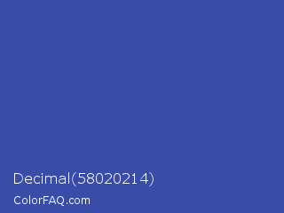 Decimal 58020214 Color is a normal blue color and the nearest color is Violet Blue #324ab2. Hex code #394ca8 and RGB value is rgb(57,76,168). In RGB color space, this color is composed of 22% red, 30% green, 66% blue, In CMYK color space, this color is composed of 66% cyan, 55% magenta, 0% yellow , 34% black , In HSL color space, this color has a hue angle of 230° , 49% saturation and 44% lightness.