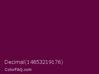 Decimal 14853219176 Color is a very dark magenta color and the nearest color is Tyrian Purple #66023c. Hex code #620440 and RGB value is rgb(98,4,64). In RGB color space, this color is composed of 38% red, 2% green, 25% blue, In CMYK color space, this color is composed of 0% cyan, 96% magenta, 35% yellow , 62% black , In HSL color space, this color has a hue angle of 322° , 92% saturation and 20% lightness.