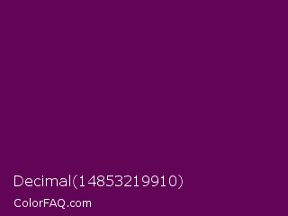 Decimal 14853219910 Color is a very dark magenta color and the nearest color is Pompadour #660045. Hex code #620556 and RGB value is rgb(98,5,86). In RGB color space, this color is composed of 38% red, 2% green, 34% blue, In CMYK color space, this color is composed of 0% cyan, 95% magenta, 12% yellow , 62% black , In HSL color space, this color has a hue angle of 308° , 90% saturation and 20% lightness.
