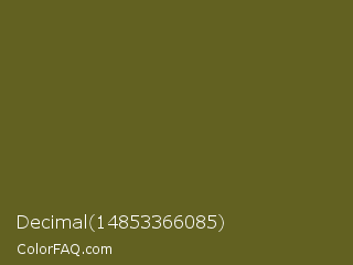 Decimal 14853366085 Color is a dark yellow color and the nearest color is Antique Bronze #665d1e. Hex code #626121 and RGB value is rgb(98,97,33). In RGB color space, this color is composed of 38% red, 38% green, 13% blue, In CMYK color space, this color is composed of 0% cyan, 1% magenta, 66% yellow , 62% black , In HSL color space, this color has a hue angle of 59° , 50% saturation and 26% lightness.