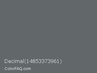 Decimal 14853373961 Color is a normal cyan color and the nearest color is Granite Gray #676767. Hex code #626869 and RGB value is rgb(98,104,105). In RGB color space, this color is composed of 38% red, 41% green, 41% blue, In CMYK color space, this color is composed of 7% cyan, 1% magenta, 0% yellow , 59% black , In HSL color space, this color has a hue angle of 189° , 3% saturation and 40% lightness.