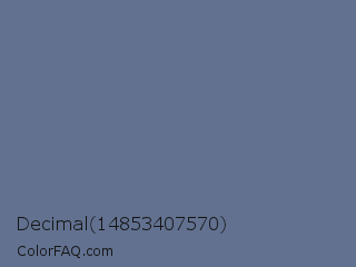 Decimal 14853407570 Color is a normal blue color and the nearest color is Waikawa Gray #5a6e9c. Hex code #627190 and RGB value is rgb(98,113,144). In RGB color space, this color is composed of 38% red, 44% green, 56% blue, In CMYK color space, this color is composed of 32% cyan, 22% magenta, 0% yellow , 44% black , In HSL color space, this color has a hue angle of 220° , 19% saturation and 47% lightness.