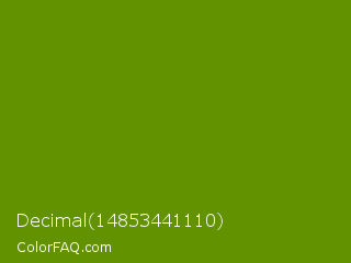 Decimal 14853441110 Color is a dark green color and the nearest color is Limeade #6f9d02. Hex code #629200 and RGB value is rgb(98,146,0). In RGB color space, this color is composed of 38% red, 57% green, 0% blue, In CMYK color space, this color is composed of 33% cyan, 0% magenta, 100% yellow , 43% black , In HSL color space, this color has a hue angle of 80° , 100% saturation and 29% lightness.