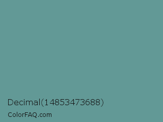 Decimal 14853473688 Color is a normal cyan color and the nearest color is Desaturated Cyan #669999. Hex code #629996 and RGB value is rgb(98,153,150). In RGB color space, this color is composed of 38% red, 60% green, 59% blue, In CMYK color space, this color is composed of 36% cyan, 0% magenta, 2% yellow , 40% black , In HSL color space, this color has a hue angle of 177° , 22% saturation and 49% lightness.