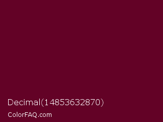 Decimal 14853632870 Color is a very dark rose color and the nearest color is Black Rose #67032d. Hex code #630226 and RGB value is rgb(99,2,38). In RGB color space, this color is composed of 39% red, 1% green, 15% blue, In CMYK color space, this color is composed of 0% cyan, 98% magenta, 62% yellow , 61% black , In HSL color space, this color has a hue angle of 338° , 96% saturation and 20% lightness.