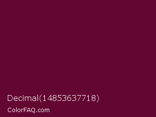 Decimal 14853637718 Color is a very dark rose color and the nearest color is Black Rose #67032d. Hex code #630730 and RGB value is rgb(99,7,48). In RGB color space, this color is composed of 39% red, 3% green, 19% blue, In CMYK color space, this color is composed of 0% cyan, 93% magenta, 52% yellow , 61% black , In HSL color space, this color has a hue angle of 333° , 87% saturation and 21% lightness.