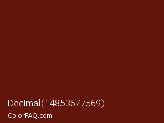 Decimal 14853677569 Color is a very dark red color and the nearest color is Dark Tan #661010. Hex code #631509 and RGB value is rgb(99,21,9). In RGB color space, this color is composed of 39% red, 8% green, 4% blue, In CMYK color space, this color is composed of 0% cyan, 79% magenta, 91% yellow , 61% black , In HSL color space, this color has a hue angle of 8° , 83% saturation and 21% lightness.