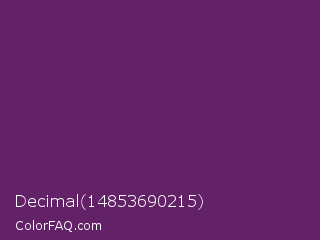 Decimal 14853690215 Color is a dark magenta color and the nearest color is Palatinate Purple #682860. Hex code #632167 and RGB value is rgb(99,33,103). In RGB color space, this color is composed of 39% red, 13% green, 40% blue, In CMYK color space, this color is composed of 4% cyan, 68% magenta, 0% yellow , 60% black , In HSL color space, this color has a hue angle of 297° , 51% saturation and 27% lightness.