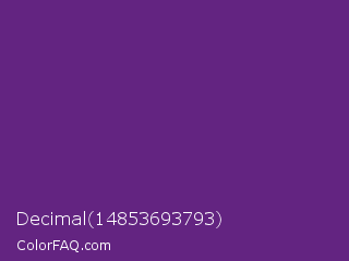Decimal 14853693793 Color is a normal purple color and the nearest color is Eminence #6c3082. Hex code #632481 and RGB value is rgb(99,36,129). In RGB color space, this color is composed of 39% red, 14% green, 51% blue, In CMYK color space, this color is composed of 23% cyan, 72% magenta, 0% yellow , 49% black , In HSL color space, this color has a hue angle of 281° , 56% saturation and 32% lightness.