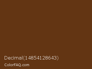 Decimal 14854128643 Color is a dark orange color and the nearest color is Jambalaya #5b3013. Hex code #633513 and RGB value is rgb(99,53,19). In RGB color space, this color is composed of 39% red, 21% green, 7% blue, In CMYK color space, this color is composed of 0% cyan, 46% magenta, 81% yellow , 61% black , In HSL color space, this color has a hue angle of 26° , 68% saturation and 23% lightness.