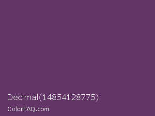 Decimal 14854128775 Color is a normal magenta color and the nearest color is Imperial #602f6b. Hex code #633567 and RGB value is rgb(99,53,103). In RGB color space, this color is composed of 39% red, 21% green, 40% blue, In CMYK color space, this color is composed of 4% cyan, 49% magenta, 0% yellow , 60% black , In HSL color space, this color has a hue angle of 295° , 32% saturation and 31% lightness.
