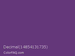 Decimal 14854131735 Color is a normal purple color and the nearest color is Eminence #6c3082. Hex code #633779 and RGB value is rgb(99,55,121). In RGB color space, this color is composed of 39% red, 22% green, 47% blue, In CMYK color space, this color is composed of 18% cyan, 55% magenta, 0% yellow , 53% black , In HSL color space, this color has a hue angle of 280° , 38% saturation and 35% lightness.
