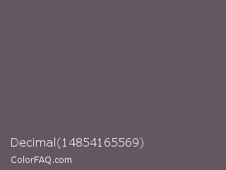 Decimal 14854165569 Color is a normal magenta color and the nearest color is Scorpion #695f62. Hex code #635861 and RGB value is rgb(99,88,97). In RGB color space, this color is composed of 39% red, 35% green, 38% blue, In CMYK color space, this color is composed of 0% cyan, 11% magenta, 2% yellow , 61% black , In HSL color space, this color has a hue angle of 311° , 6% saturation and 37% lightness.