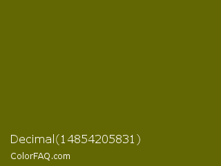 Decimal 14854205831 Color is a very dark yellow color and the nearest color is Bronze Yellow #737000. Hex code #636703 and RGB value is rgb(99,103,3). In RGB color space, this color is composed of 39% red, 40% green, 1% blue, In CMYK color space, this color is composed of 4% cyan, 0% magenta, 97% yellow , 60% black , In HSL color space, this color has a hue angle of 62° , 94% saturation and 21% lightness.