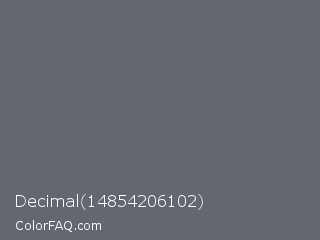 Decimal 14854206102 Color is a normal blue color and the nearest color is Shuttle Gray #5f6672. Hex code #636770 and RGB value is rgb(99,103,112). In RGB color space, this color is composed of 39% red, 40% green, 44% blue, In CMYK color space, this color is composed of 12% cyan, 8% magenta, 0% yellow , 56% black , In HSL color space, this color has a hue angle of 222° , 6% saturation and 41% lightness.