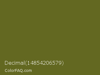 Decimal 14854206579 Color is a dark yellow color and the nearest color is Fern Frond #657220. Hex code #636821 and RGB value is rgb(99,104,33). In RGB color space, this color is composed of 39% red, 41% green, 13% blue, In CMYK color space, this color is composed of 5% cyan, 0% magenta, 68% yellow , 59% black , In HSL color space, this color has a hue angle of 64° , 52% saturation and 27% lightness.