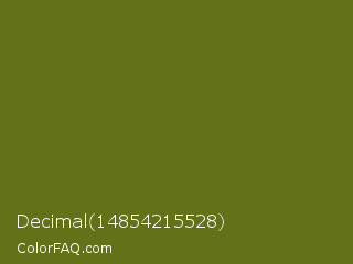 Decimal 14854215528 Color is a dark yellow color and the nearest color is Fern Frond #657220. Hex code #637118 and RGB value is rgb(99,113,24). In RGB color space, this color is composed of 39% red, 44% green, 9% blue, In CMYK color space, this color is composed of 12% cyan, 0% magenta, 79% yellow , 56% black , In HSL color space, this color has a hue angle of 69° , 65% saturation and 27% lightness.