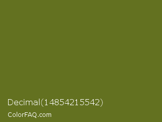 Decimal 14854215542 Color is a dark yellow color and the nearest color is Fern Frond #657220. Hex code #637120 and RGB value is rgb(99,113,32). In RGB color space, this color is composed of 39% red, 44% green, 13% blue, In CMYK color space, this color is composed of 12% cyan, 0% magenta, 72% yellow , 56% black , In HSL color space, this color has a hue angle of 70° , 56% saturation and 28% lightness.