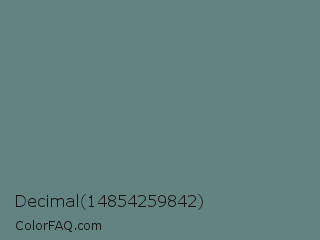 Decimal 14854259842 Color is a normal cyan color and the nearest color is Aurometalsaurus #6e7f80. Hex code #638382 and RGB value is rgb(99,131,130). In RGB color space, this color is composed of 39% red, 51% green, 51% blue, In CMYK color space, this color is composed of 24% cyan, 0% magenta, 1% yellow , 49% black , In HSL color space, this color has a hue angle of 178° , 14% saturation and 45% lightness.