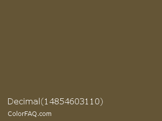 Decimal 14854603110 Color is a dark orange color and the nearest color is Costa Del Sol #615d30. Hex code #645536 and RGB value is rgb(100,85,54). In RGB color space, this color is composed of 39% red, 33% green, 21% blue, In CMYK color space, this color is composed of 0% cyan, 15% magenta, 46% yellow , 61% black , In HSL color space, this color has a hue angle of 40° , 30% saturation and 30% lightness.