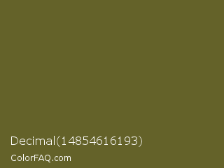 Decimal 14854616193 Color is a dark yellow color and the nearest color is Costa Del Sol #615d30. Hex code #646229 and RGB value is rgb(100,98,41). In RGB color space, this color is composed of 39% red, 38% green, 16% blue, In CMYK color space, this color is composed of 0% cyan, 2% magenta, 59% yellow , 61% black , In HSL color space, this color has a hue angle of 58° , 42% saturation and 28% lightness.