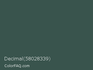 Decimal 58028339 Color is a dark cyan color and the nearest color is Dark Slate Gray #2f4f4f. Hex code #39544d and RGB value is rgb(57,84,77). In RGB color space, this color is composed of 22% red, 33% green, 30% blue, In CMYK color space, this color is composed of 32% cyan, 0% magenta, 8% yellow , 67% black , In HSL color space, this color has a hue angle of 164° , 19% saturation and 28% lightness.