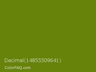 Decimal 14855509641 Color is a dark lime color and the nearest color is Avocado #568203. Hex code #658409 and RGB value is rgb(101,132,9). In RGB color space, this color is composed of 40% red, 52% green, 4% blue, In CMYK color space, this color is composed of 23% cyan, 0% magenta, 93% yellow , 48% black , In HSL color space, this color has a hue angle of 75° , 87% saturation and 28% lightness.