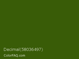 Decimal 58036497 Color is a very dark green color and the nearest color is Dell #396413. Hex code #395c07 and RGB value is rgb(57,92,7). In RGB color space, this color is composed of 22% red, 36% green, 3% blue, In CMYK color space, this color is composed of 38% cyan, 0% magenta, 92% yellow , 64% black , In HSL color space, this color has a hue angle of 85° , 86% saturation and 19% lightness.