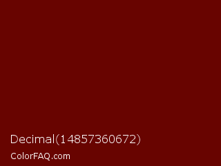 Decimal 14857360672 Color is a very dark red color and the nearest color is Lonestar #6d0101. Hex code #680400 and RGB value is rgb(104,4,0). In RGB color space, this color is composed of 41% red, 2% green, 0% blue, In CMYK color space, this color is composed of 0% cyan, 96% magenta, 100% yellow , 59% black , In HSL color space, this color has a hue angle of 2° , 100% saturation and 20% lightness.