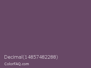 Decimal 14857482288 Color is a normal magenta color and the nearest color is Zambezi #685558. Hex code #684866 and RGB value is rgb(104,72,102). In RGB color space, this color is composed of 41% red, 28% green, 40% blue, In CMYK color space, this color is composed of 0% cyan, 31% magenta, 2% yellow , 59% black , In HSL color space, this color has a hue angle of 304° , 18% saturation and 35% lightness.