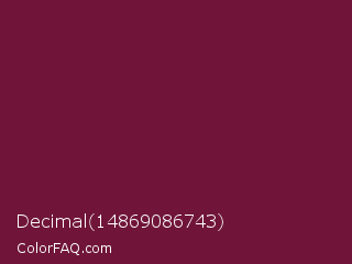 Decimal 14869086743 Color is a dark rose color and the nearest color is Claret #7f1734. Hex code #701539 and RGB value is rgb(112,21,57). In RGB color space, this color is composed of 44% red, 8% green, 22% blue, In CMYK color space, this color is composed of 0% cyan, 81% magenta, 49% yellow , 56% black , In HSL color space, this color has a hue angle of 336° , 68% saturation and 26% lightness.