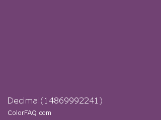 Decimal 14869992241 Color is a normal magenta color and the nearest color is Maximum Purple #733380. Hex code #714273 and RGB value is rgb(113,66,115). In RGB color space, this color is composed of 44% red, 26% green, 45% blue, In CMYK color space, this color is composed of 2% cyan, 43% magenta, 0% yellow , 55% black , In HSL color space, this color has a hue angle of 298° , 27% saturation and 35% lightness.