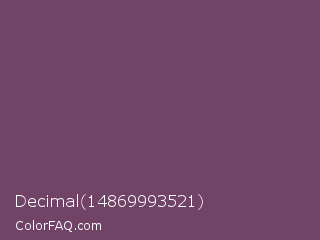 Decimal 14869993521 Color is a normal magenta color and the nearest color is Cosmic #76395d. Hex code #714467 and RGB value is rgb(113,68,103). In RGB color space, this color is composed of 44% red, 27% green, 40% blue, In CMYK color space, this color is composed of 0% cyan, 40% magenta, 9% yellow , 56% black , In HSL color space, this color has a hue angle of 313° , 25% saturation and 35% lightness.