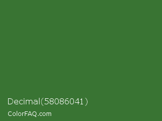 Decimal 58086041 Color is a normal green color and the nearest color is Mughal Green #306030. Hex code #397433 and RGB value is rgb(57,116,51). In RGB color space, this color is composed of 22% red, 45% green, 20% blue, In CMYK color space, this color is composed of 51% cyan, 0% magenta, 56% yellow , 55% black , In HSL color space, this color has a hue angle of 114° , 39% saturation and 33% lightness.